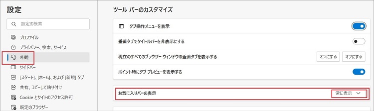「ツールバーのカスタマイズ」項目の「お気に入りバーの表示」の右側にある選択部分を