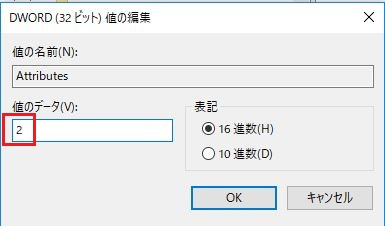 右側ペインの「Attributes」をダブルクリックします。 値のデータを「2」へ変更してOKをクリックします。