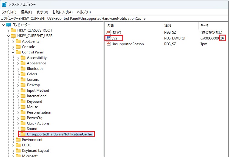 このキーの名前を「UnsupportedHardwareNotificationCache」に変更します。